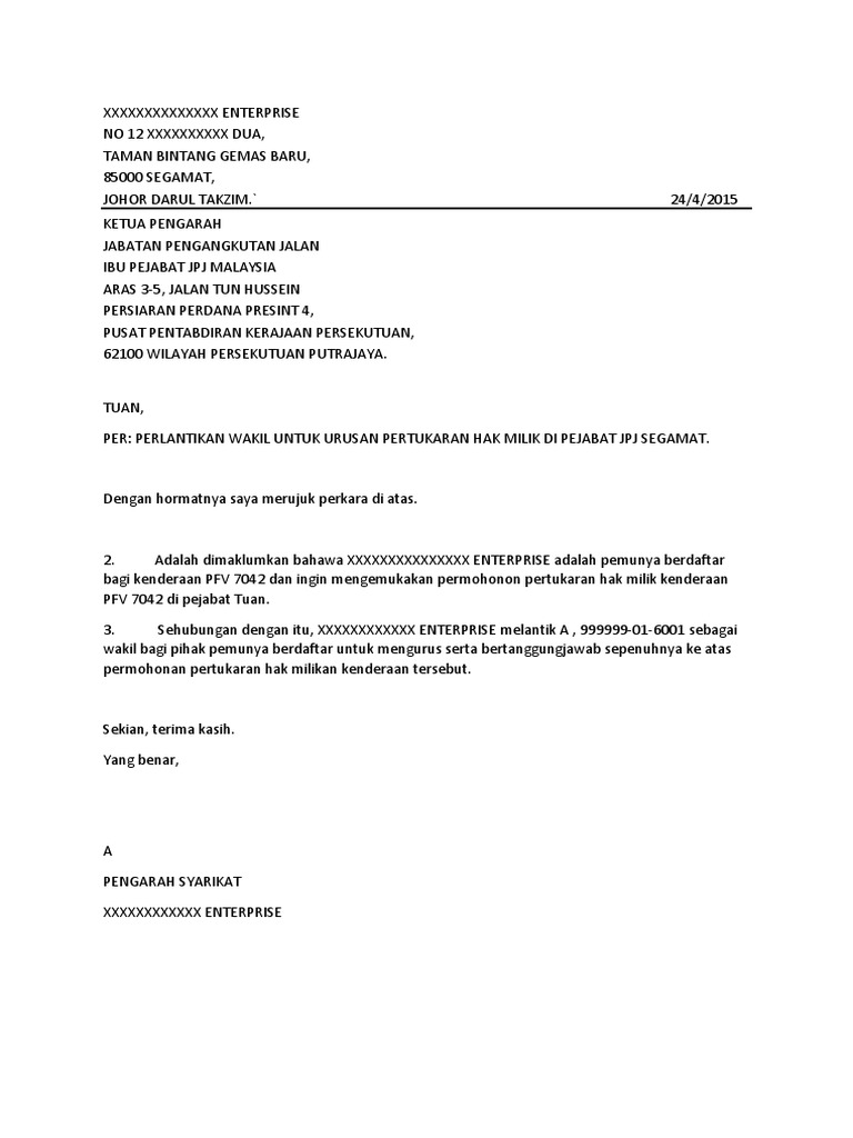 Kalau sudah begini, mau tidak mau kita harus menunjuk orang lain untuk mewakili dan melakukan pengurusan. Contoh surat yang satu ini biasanya akan dipergunakan oleh perkumpulan ataupun mewakili kelompok tertentu. Jika anda merasa cocok dengan tawaran kerjasama tersebut pasal 1 pihak kesatu mewakili kelompok pengrajin boneka mukti karsa menyetujui untuk. Contoh surat wakil majikan lhdn format gambar contoh surat wakil kuasa lhdn yang benar 2019 surat lantikan wakil syarikat untuk berurusan dengan myeg sebab : terkini contoh surat rasmi kebenaran bekerja daripada majikan yang perlu ditunjukkan kepada polis/roadblock ketika pkp atau pkpb. Contoh surat lamaran kerja yang umum, contoh surat memberi kuasa kepada wakil malaysia, contoh surat lamaran kerja untuk fresh graduate, contoh surat lamaran kerja via email. kemaskini ini merupakan format atau contoh surat rasmi kebenaran bekerja daripada majikan yang perlu ditunjukkan oleh pekerja bagi mengelakkan ditahan. Untukmu yang duduk sambil diskusiuntukmu yang biasa bersafaridi sana, di gedung dpr wakil rakyat kumpulan orang hebatbukan kumpulan teman teman dekatapalagi sanak famili di hati dan lidahmu kami berharapsuara kami tolong dengar lalu. Berikut merupakan contoh surat yang perlu dibawa bersama sekiranya majikan tidak dapat melakukan urusan kontrak pembantu kerja di kedutaan indonesia. Contoh surat perwakilan kuasa mewakili syarikat. Listados gratuitos de propiedades disponibles. Merujuk kepada perkara diatas, adalah dimaklumkan bahawa geetha a/p manivannan no. .majikan kepala surat (syarikat) no rujukan :